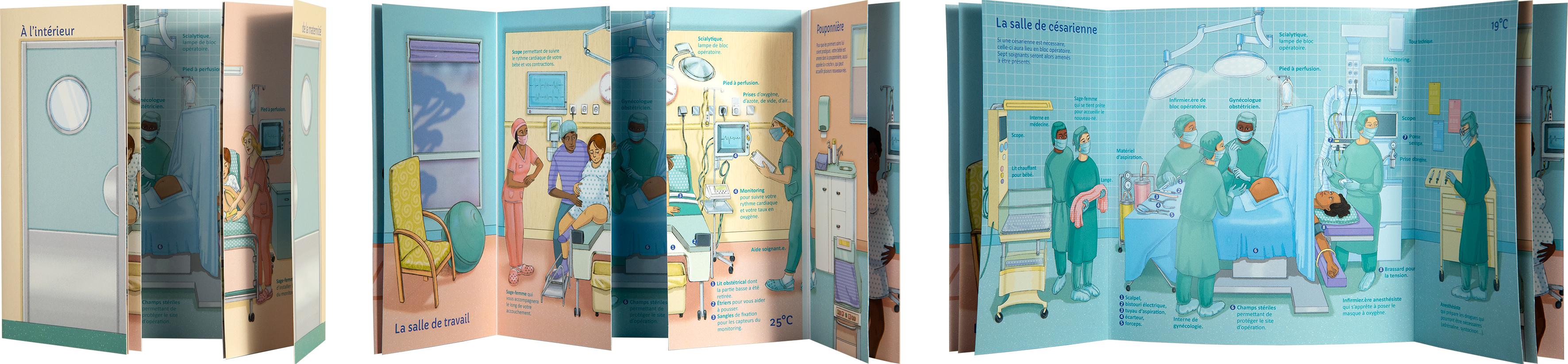 2. Livret présentant différents espaces de la maternité: salle de pré-travail, salle de travail et salle de césarienne.